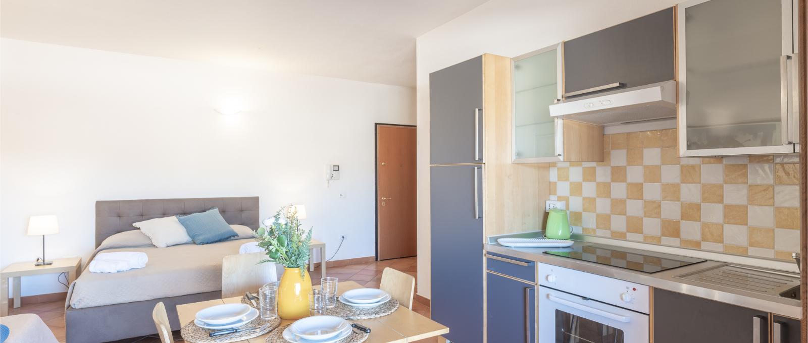 Les studios pour quatre personnes (25/30 m²) comprennent : un séjour avec coin cuisine, un lit double, un canapé-lit double ou deux poufs convertibles en lits simples, une salle de bain avec douche et sèche-cheveux. Ils sont tous équipés de : climatisation, Wi-Fi, four électrique, micro-ondes, bouilloire, grille-pain, télévision, coffre-fort, ustensiles de cuisine. La plupart des appartements disposent d'un balcon (certains équipés d'une table et de chaises).